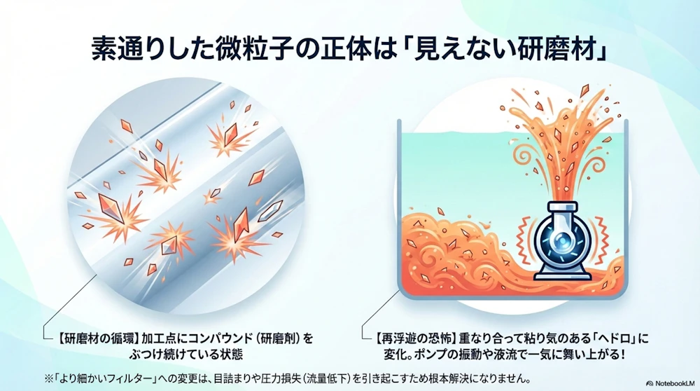 フィルターを通り抜ける微細スラッジ(5μm以下など)は、多くの場合、非常に硬い微細スラッジや砥粒の破片です。