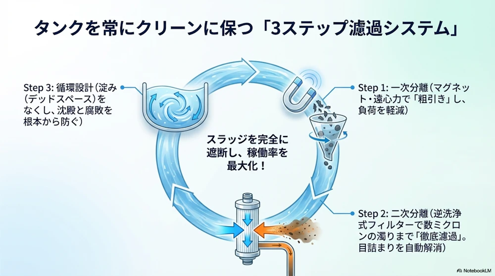- メカニズム: 高精度フィルターを用い、限界まで微細な粒子を捕捉します。目詰まりが発生する前に、定期的な「逆洗」によってスラッジを自動で剥離・排出する仕組みです。